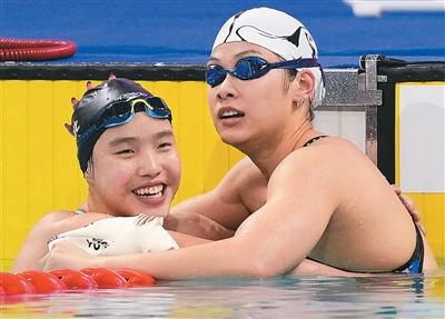 11月11日,第十五届全国运动会游泳女子200米个人混合泳决赛在深圳举行。图为河北队选手于子迪(左)在比赛后与浙江队选手余依婷拥抱致意。于子迪打破亚洲纪录获得冠军,余依婷获得亚军。新华社记者 薛宇舸摄
