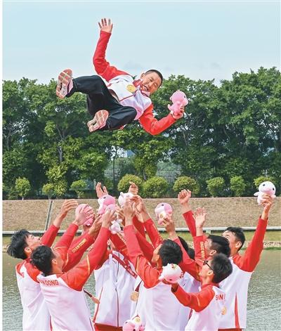 11月11日,在广州举行的第十五届全国运动会赛艇项目男子八人单桨有舵手决赛中,山东队获得冠军,湖北队获得亚军,江苏队获得季军。图为山东队选手将教练员抛向空中庆祝夺冠。新华社记者 肖恩楠摄